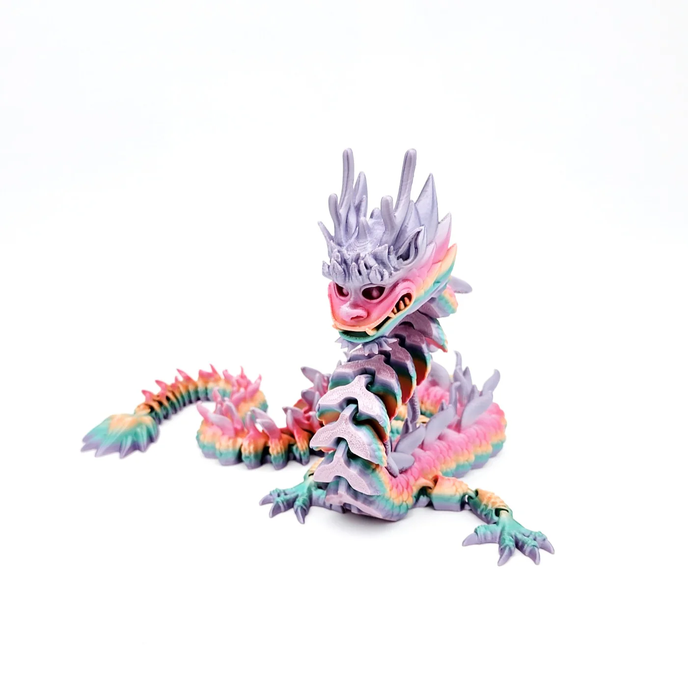 These mesmerizing 3D-printed Dragons are made from eco-friendly, biodegradable materials. Our dragons are perfect for stress relief, fidgeting, and improving the look of any desk or room! ach section of the dragon is movable and can be articulated upwards to stand upright